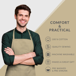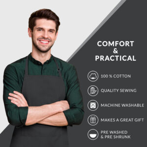 • 100% COTTON: This apron is manufactured from 100% pure cotton, assuring comfort, durability, and lightweight for long hours in the kitchen, restaurant, home, or garden
