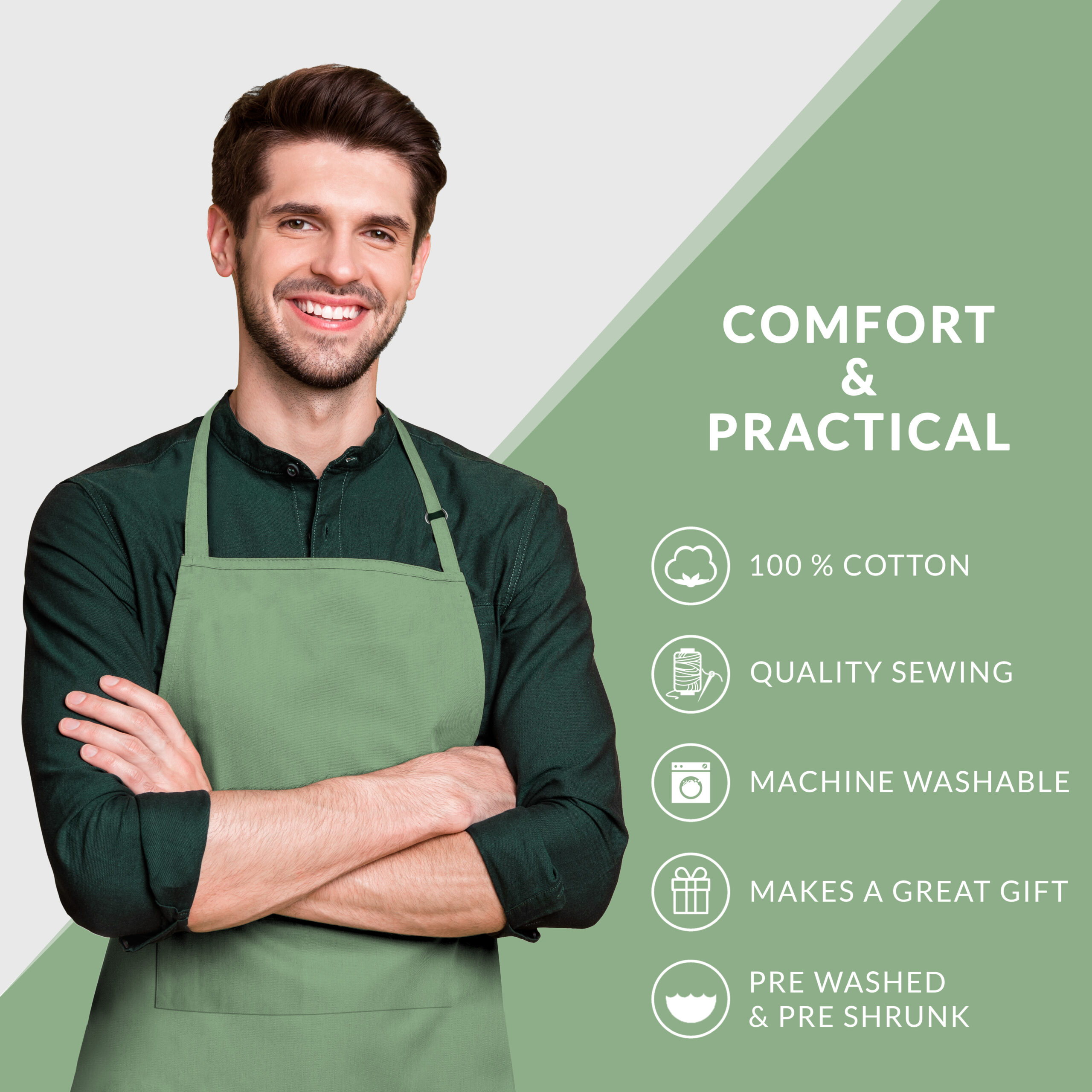 • EASY CARE: Each apron is simple to care for. Machine washable, using a warm cycle setting without bleach; tumble dry low; iron as needed