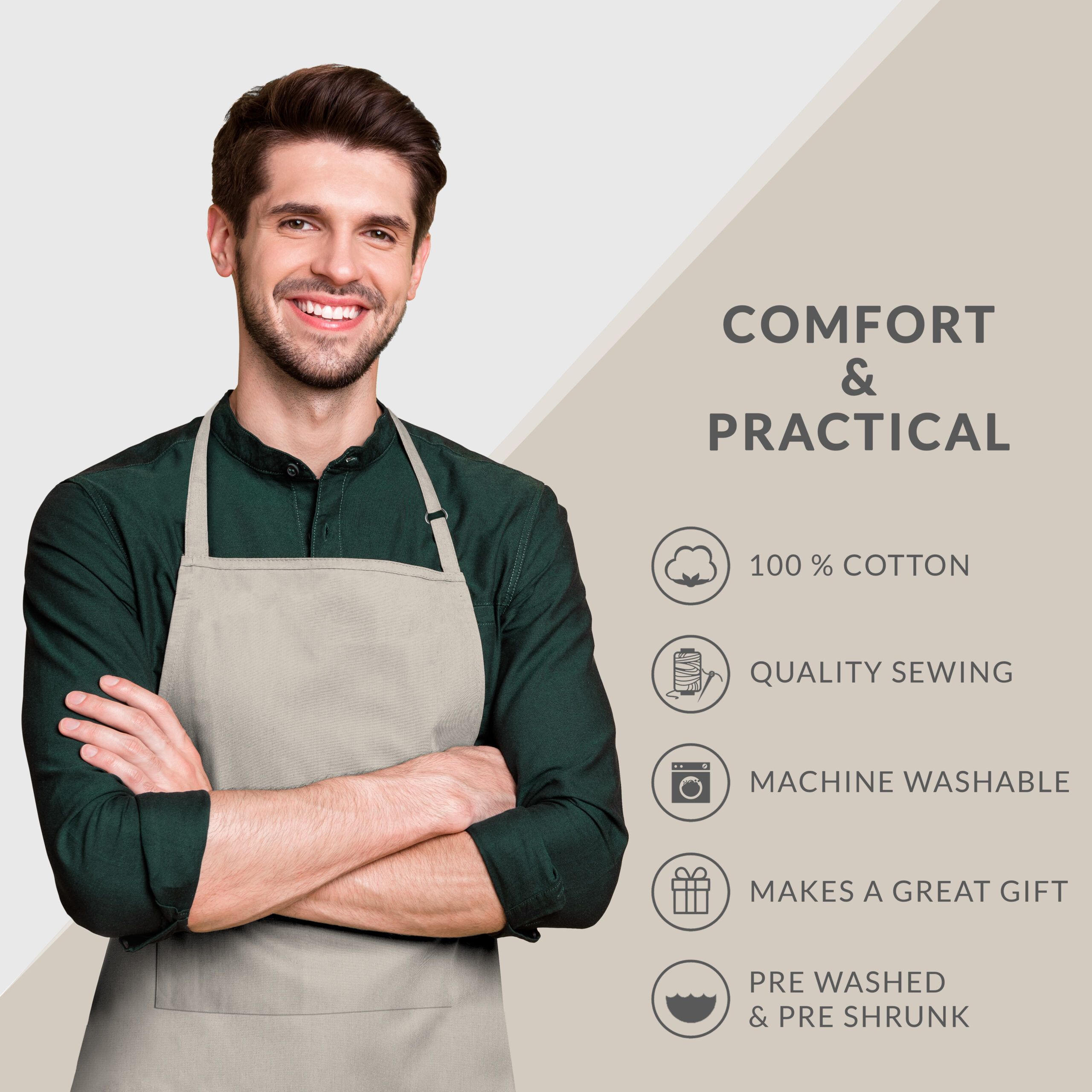 • EASY CARE: Each apron is simple to care for. Machine washable, using a warm cycle setting without bleach; tumble dry low; iron as needed